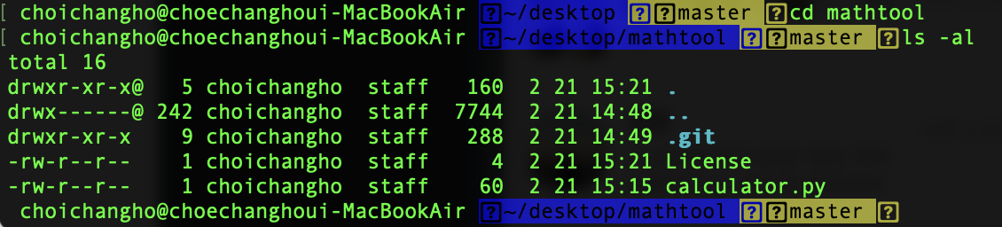 그 뒤 다시 git commit -m "Create calculator.py and License" 를 해주면 완료!