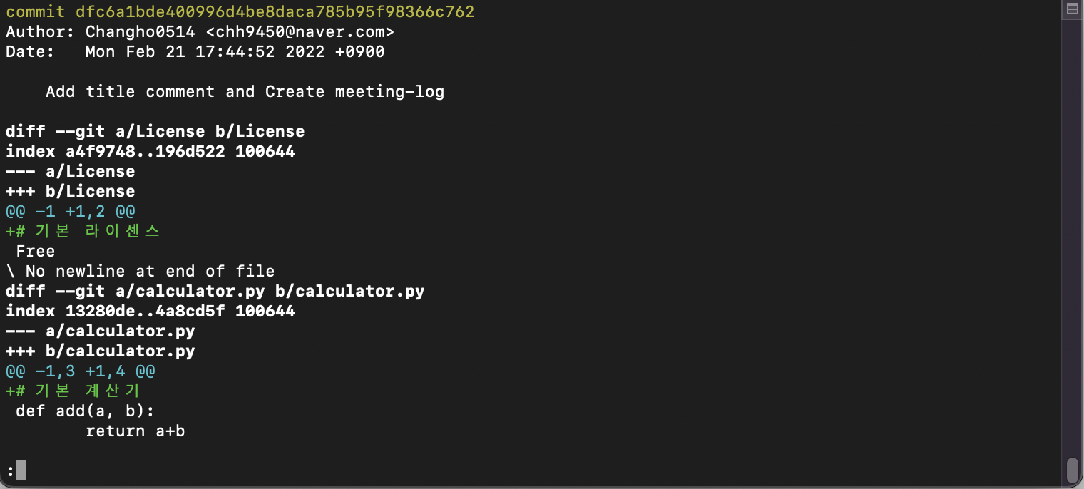 git show 하고 뒤에 커밋해시를 적어주면 되는데 대강 4자리까지 적어주기만 해도 된다