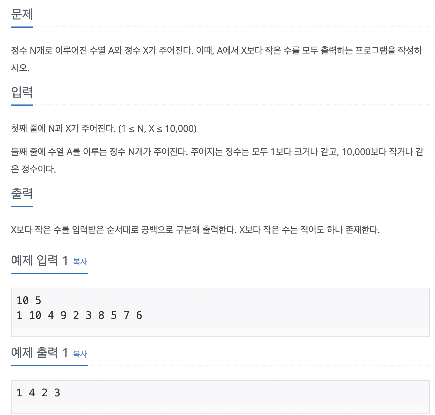 1. 첫 줄에 수열의 길이 N, 해당 수보다 작은 수를 찾기위한 변수 X가 제공되므로