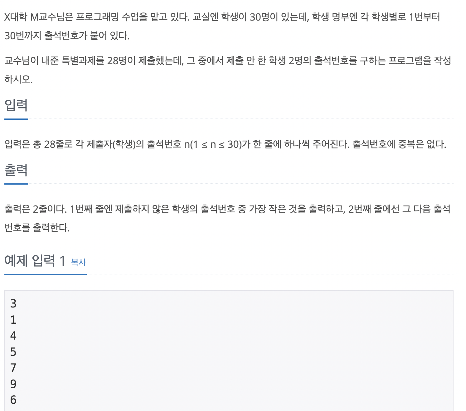 입력값(1~30)을 int a 로 받아오기 때문에 student배열은 31까지 만들어준다.(인덱스가 30까지되게끔)