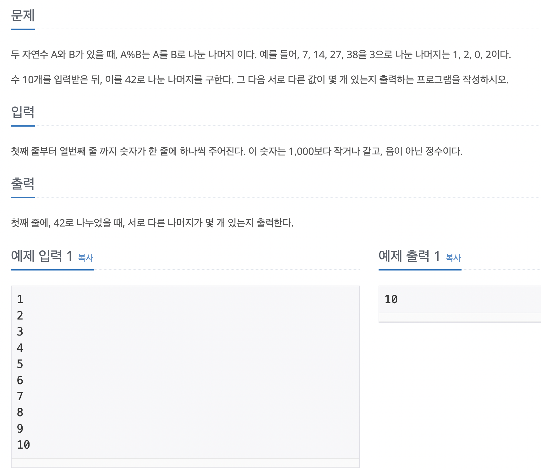 2. 입력된 10개의 수를 대상으로 42로 나눈 나머지에 해당하는 배열의 위치를 true로 바꾸어준다.