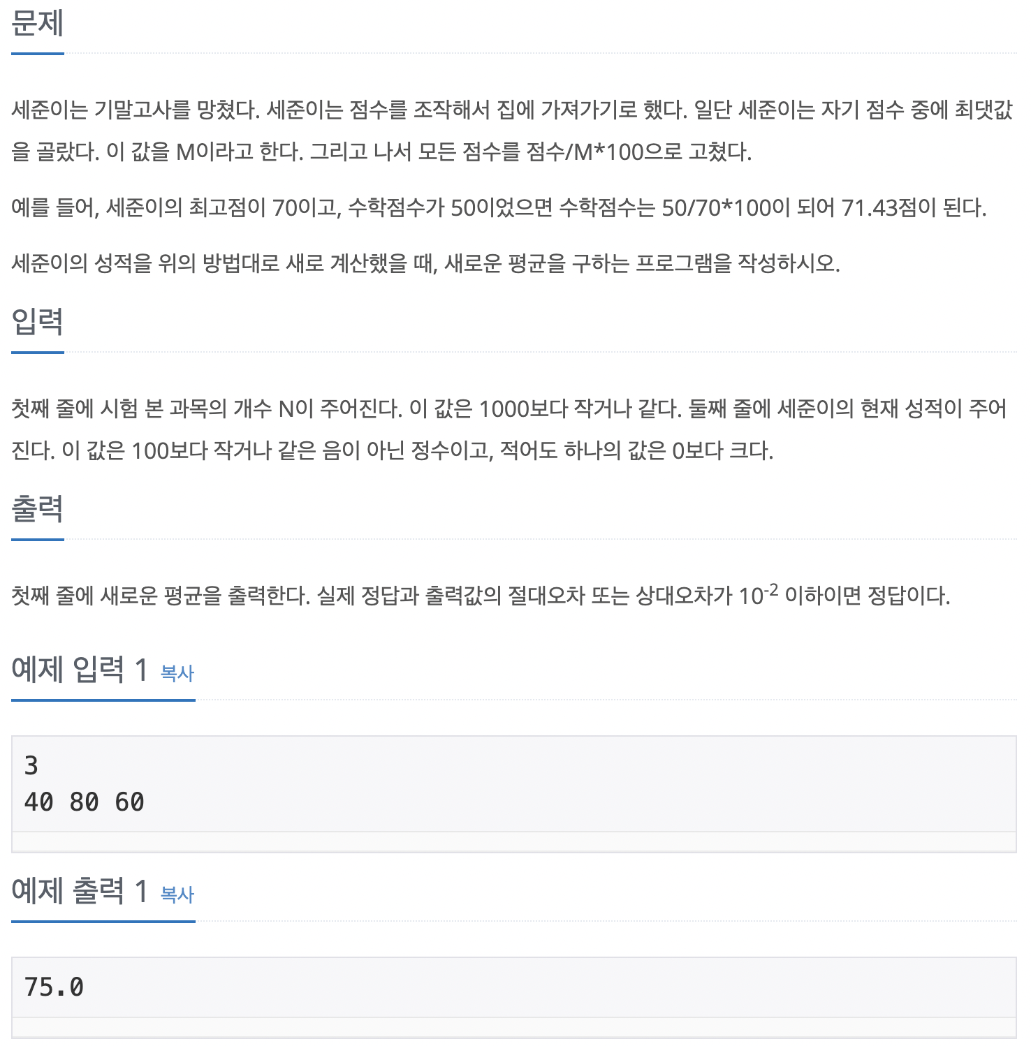 "실제 정답과 출력값의 절대오차 또는 상대오차가 10-2 이하이면 정답이다." 는 것이다.