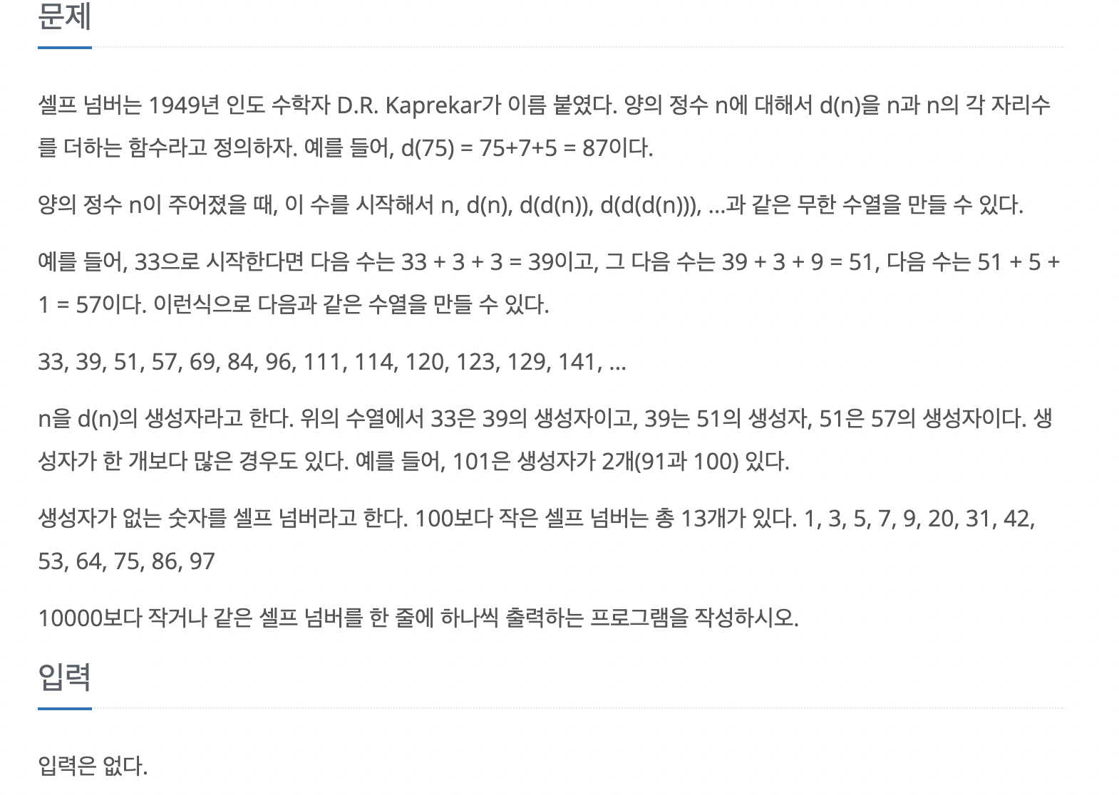 10000보다 작거나 같은 셀프 넘버를 구해야 하므로,