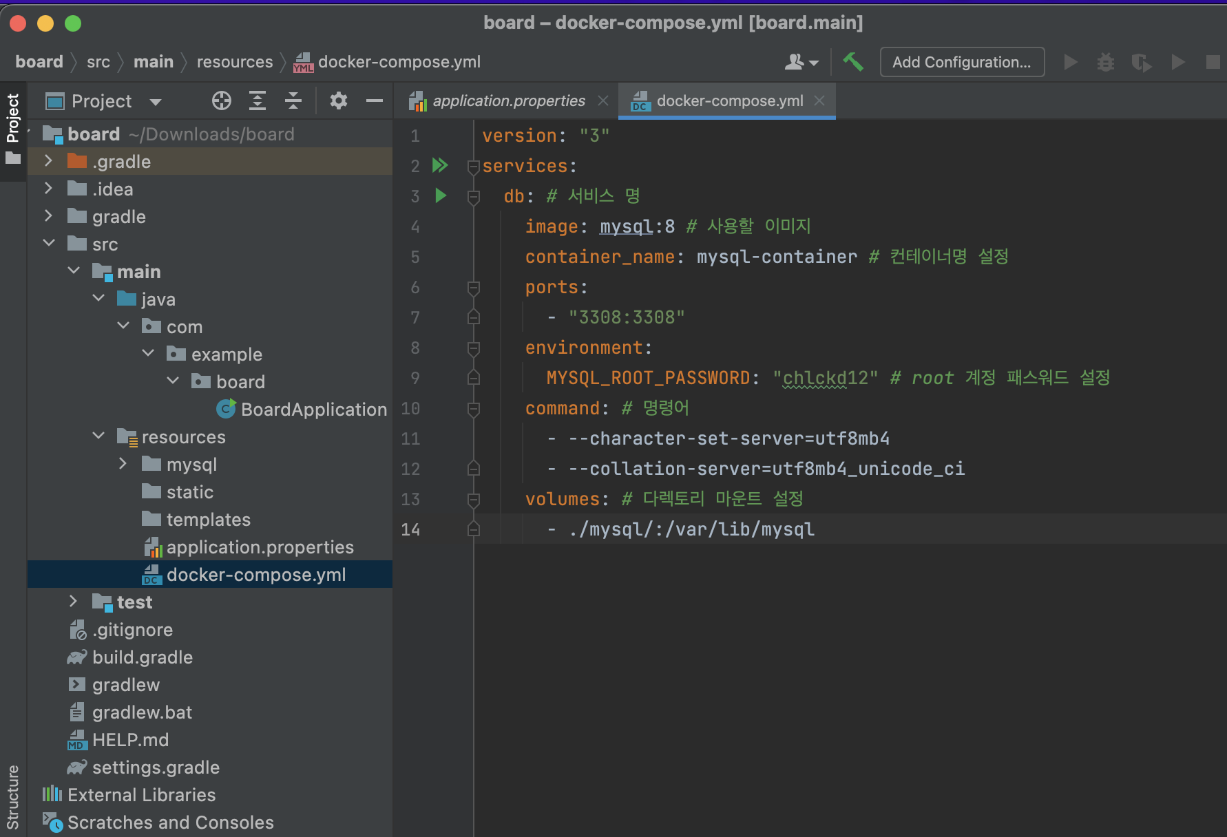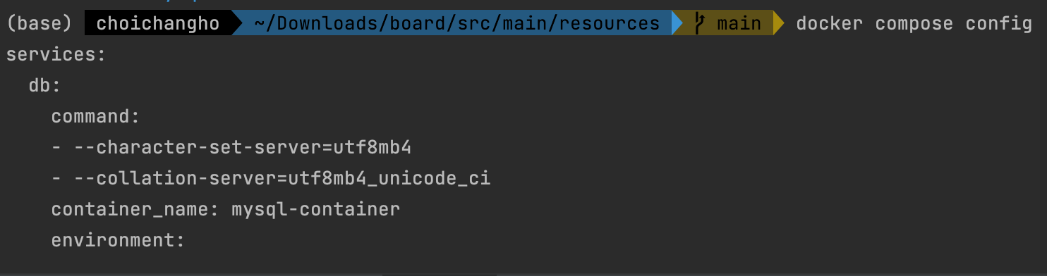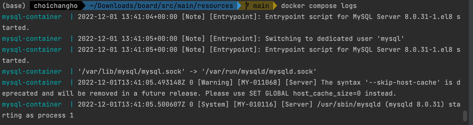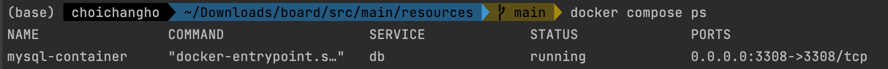 (base) ✘ choichangho ~/Downloads/board/src/main/resources main docker compose up -d