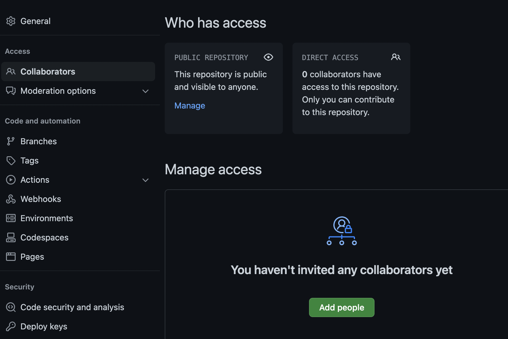 2. 왼쪽의 Collaborators > Manage access > add people 클릭
