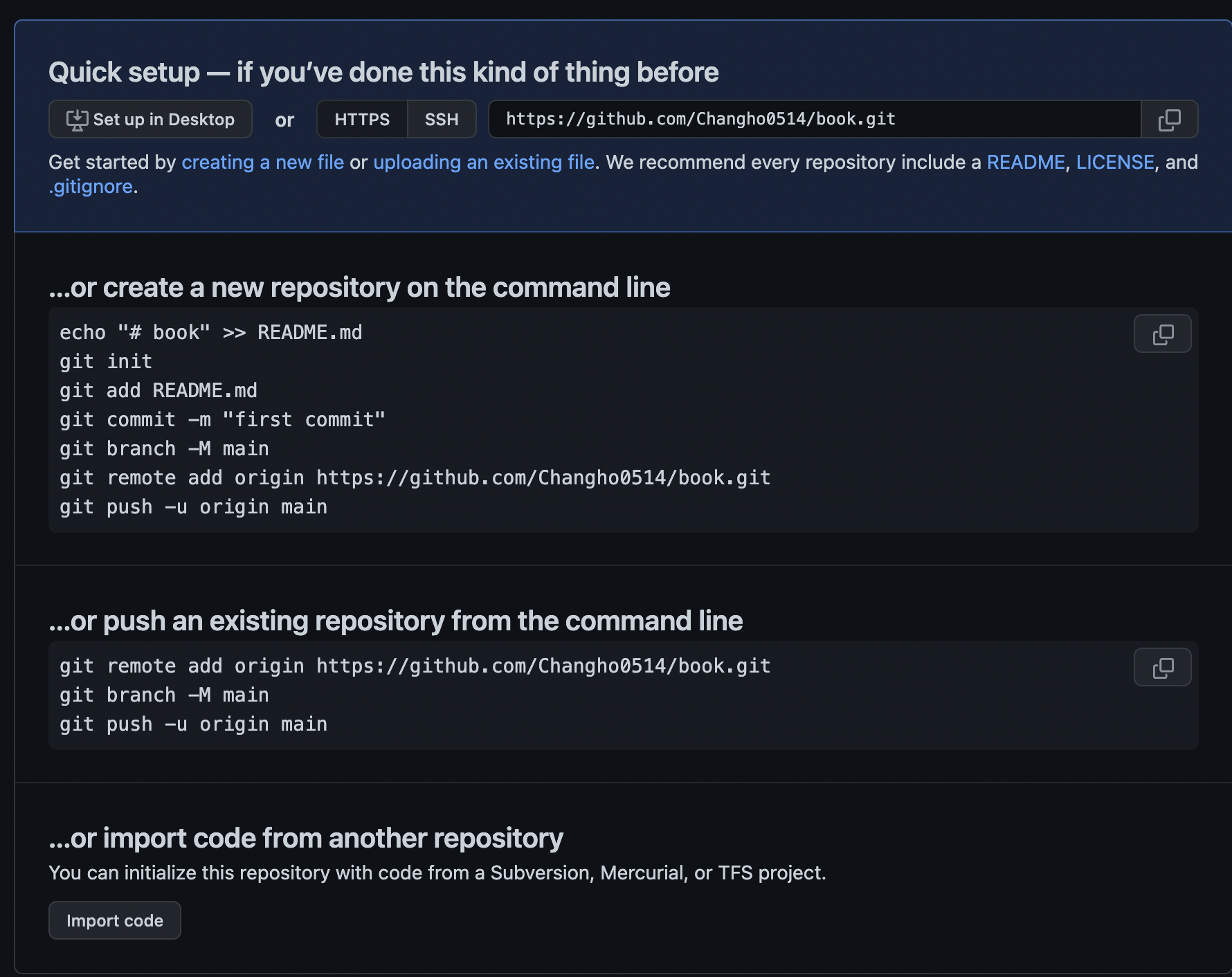 이 부분이 이미 만든 로컬 레포지토리를 깃허브에 업로드하는 것이다.