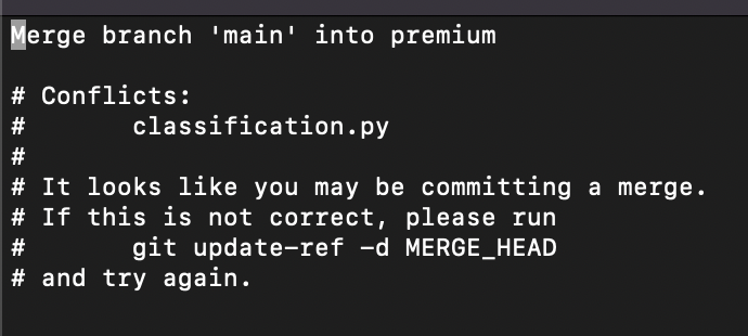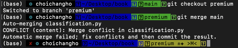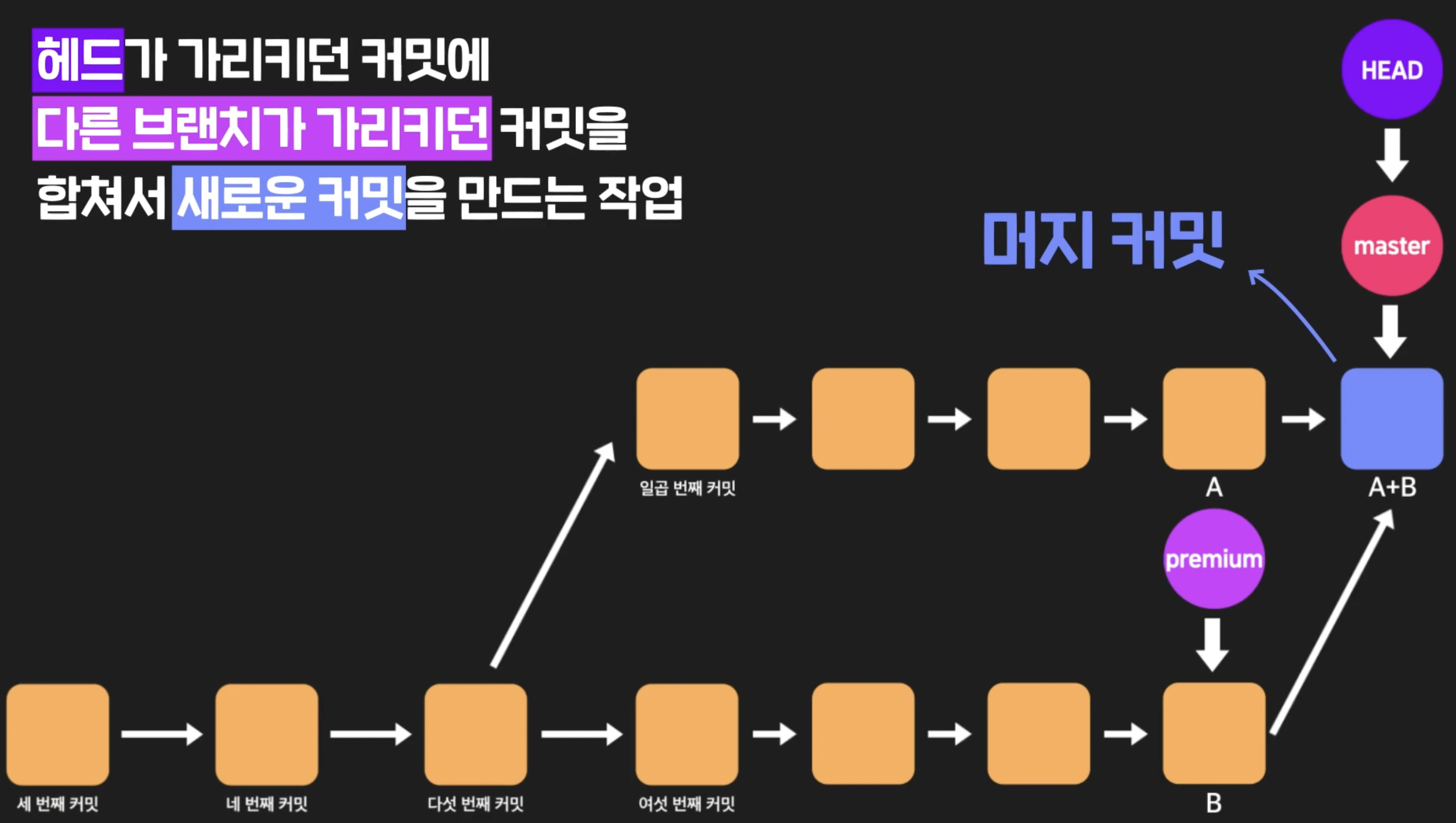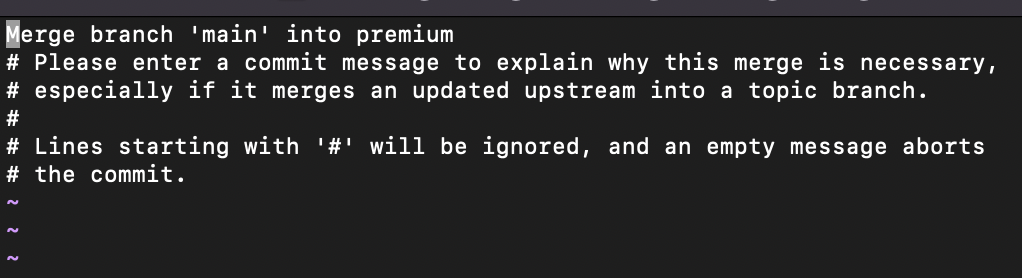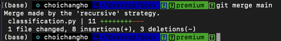 "git merge main " - 현재 위치인 premium 브랜치에 main 브랜치를 합치겠다!
