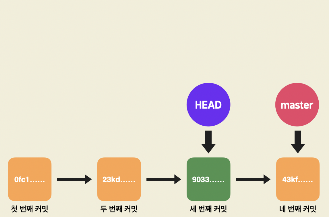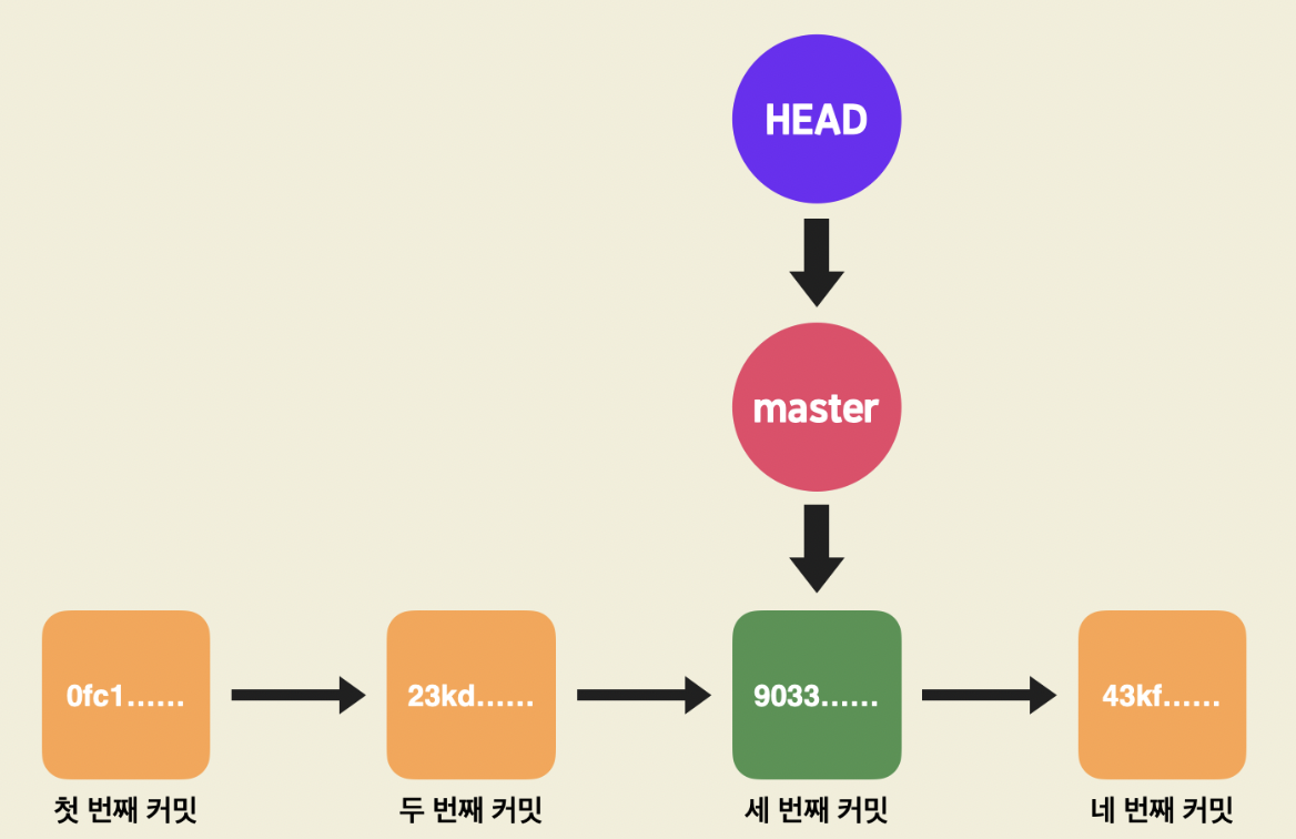 HEAD는 브랜치를 가리키고, 브랜치가 커밋을 가리킨다.