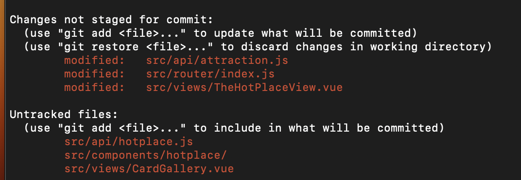"changes not staged for commit" -> pull 로서 변경된 내용이 가져와진 파일들에 대한 내용이다.