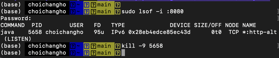 8080 port를 죽이기 위해 PID code를 알아내고,