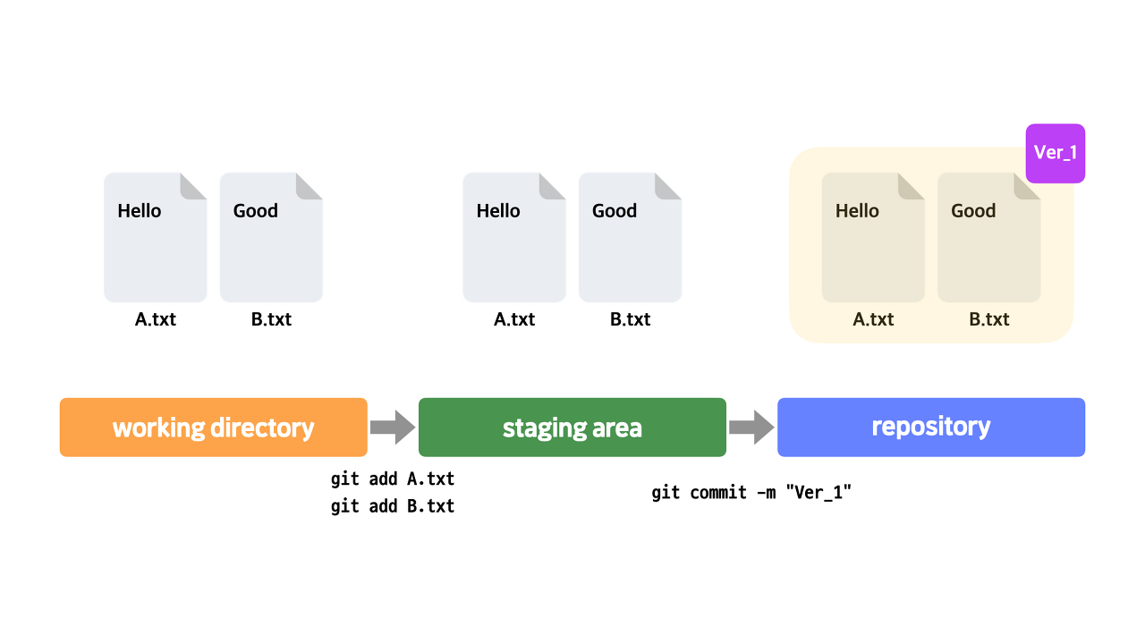 A.txt, B.txt 둘다 working directory에서 수정했다는 사실은 같지만, staging area에 올렸는지 여부에 따라 그 최신 모습이 커밋에 반영되는지가 달라지는 것.